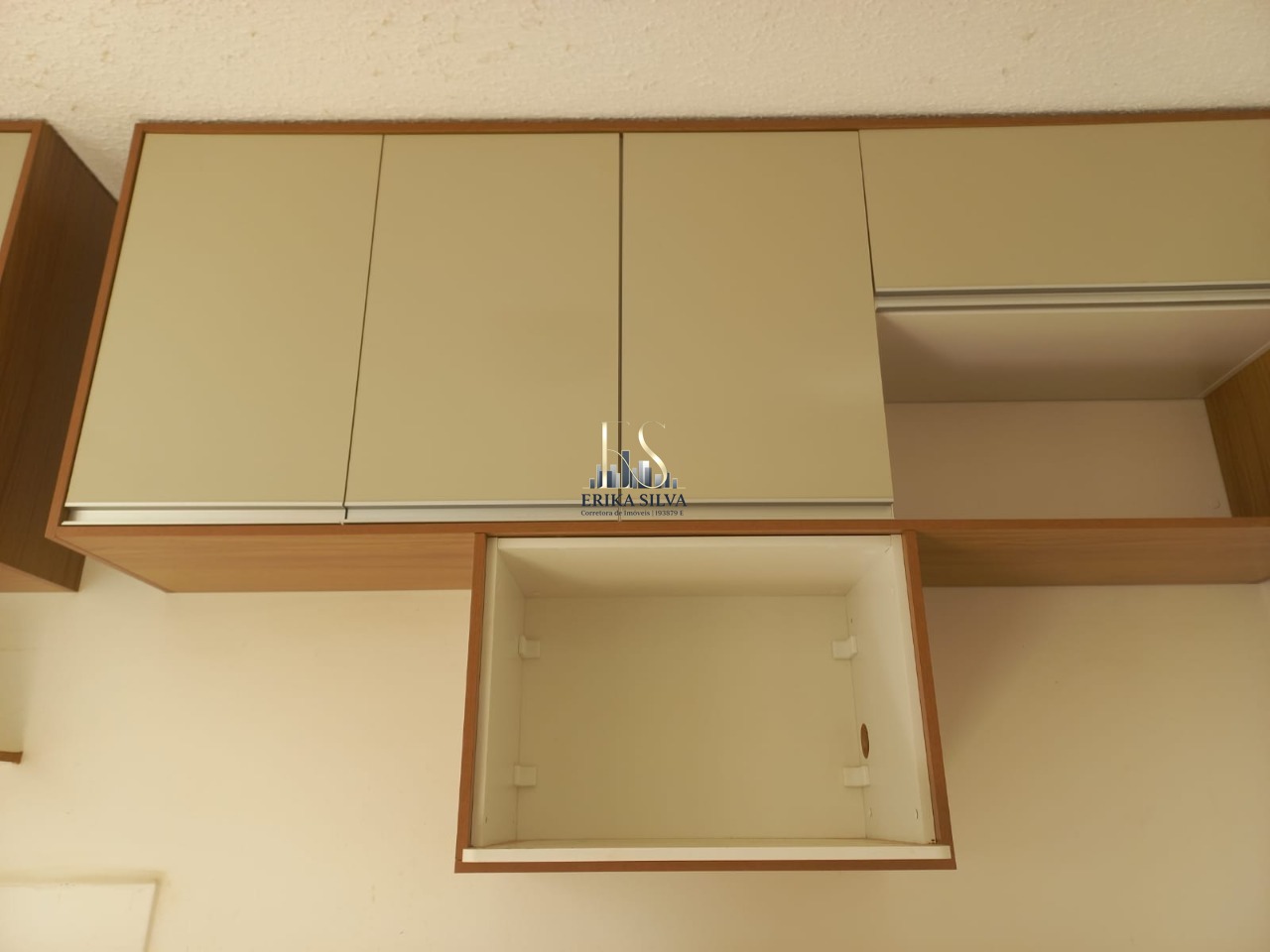 Apartamento com 2 quartos, 1 com ventilador de teto, cozinha com armários, banheiro com armário e box, sala com ventilador de teto e 1 vaga de garagem.