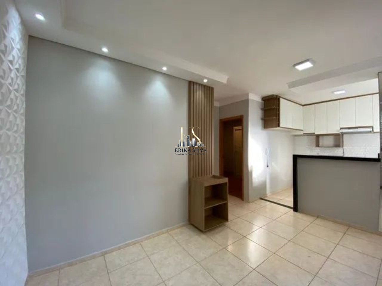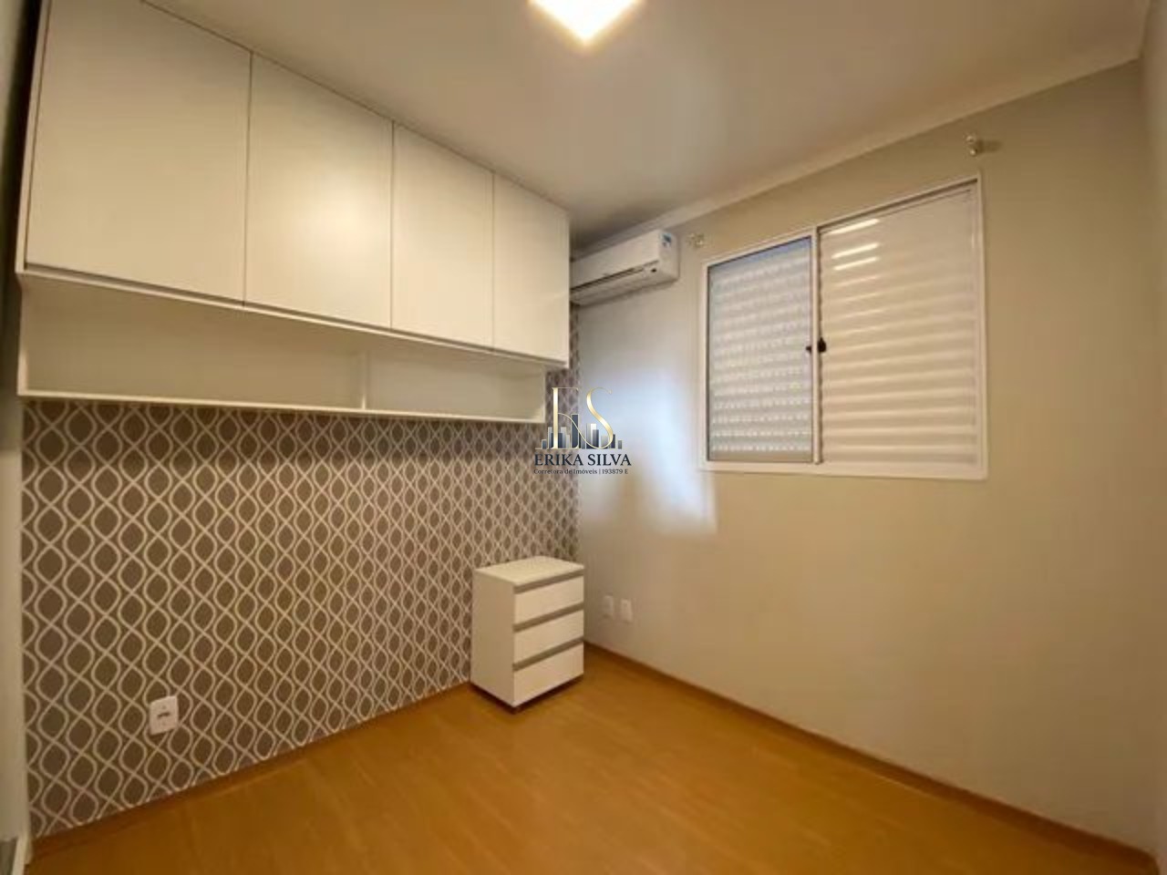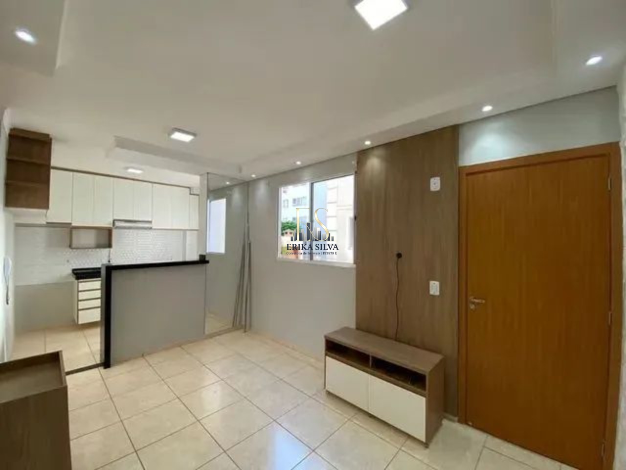 Apartamento com quarto, cozinha, sala e banheiro planejado e ar condicionado.