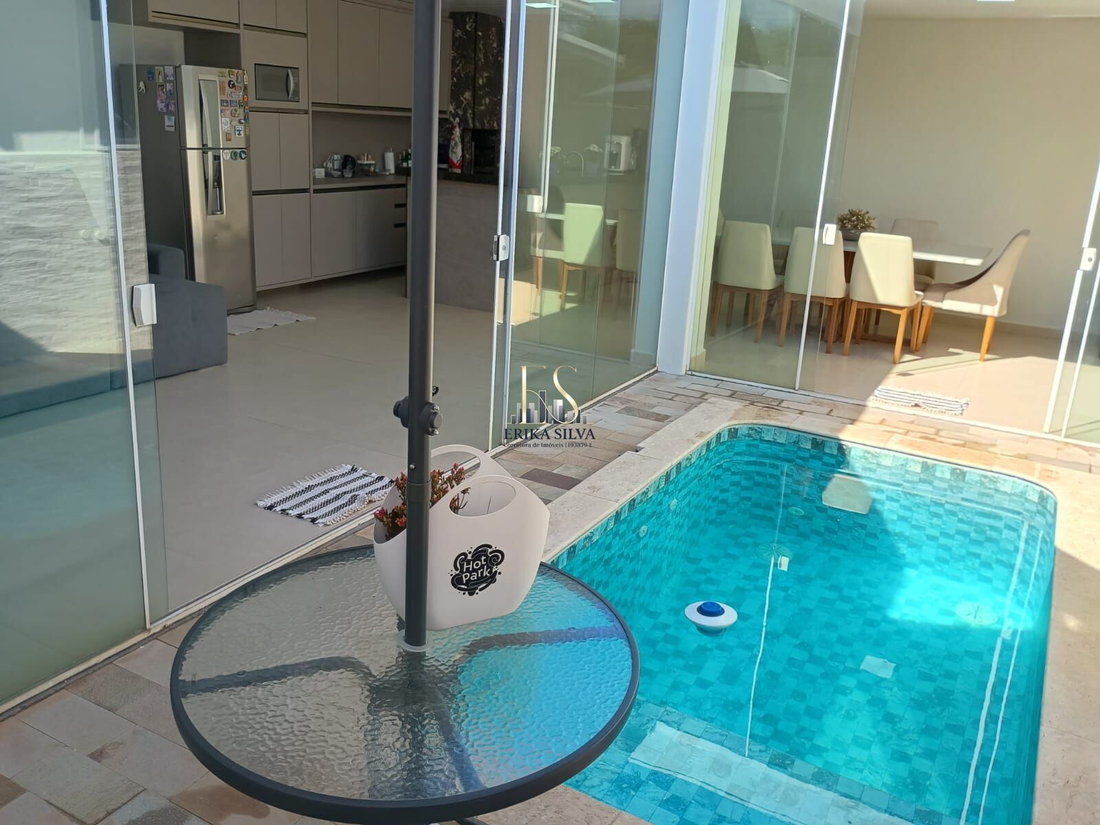 A casa conta com uma piscina aquecida, perfeita para uso o ano inteiro, integrada à área interna por amplas portas de vidro, proporcionando sofisticação e sensação de amplitude.
