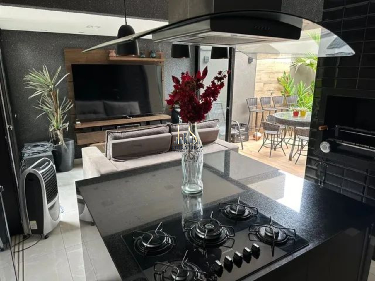 Cozinha planejada rica em armários integrada a área gourmet